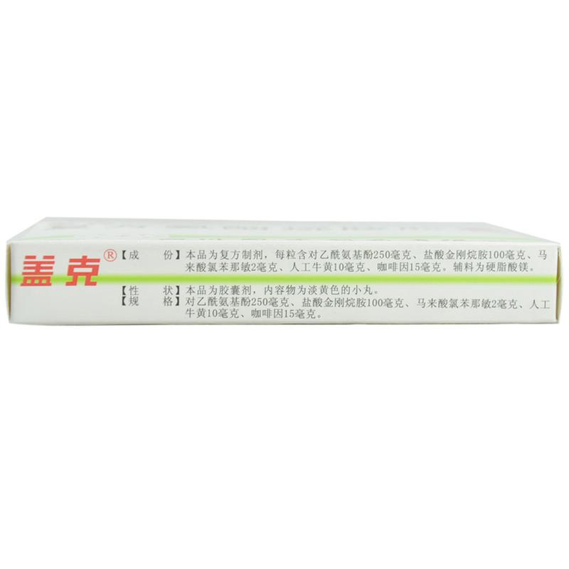 对乙酰氨基酚能抑制前列腺素合成,有解热镇痛的作用;金刚烷胺可抗“亚一甲型”流感病毒,可抑制病毒繁殖;咖啡因为中枢兴奋药,能增强对乙酰氨基酚的解热镇痛效果,并能减轻其他药物所致的嗜睡,头晕等中枢抑制作用;马来酸氯苯那敏为抗过敏药,能减轻流涕,鼻塞,打喷嚏等症状;人工牛黄具有解热,镇惊作用。上述诸药配伍制成复方,可增强解热,镇痛效果,解除或改善感冒所致之各种症状。