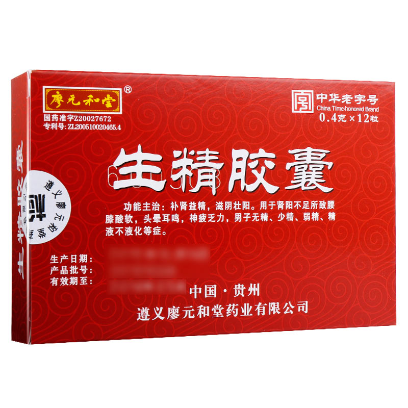 廖元和堂生精胶囊主要成分为: 鹿茸、枸杞子、人参、冬虫夏草、 菟丝子、沙苑子、淫羊藿、黄精、 何首乌、 桑椹、补骨脂、骨碎补、 仙茅、 金樱子、覆盆子、杜仲、大血藤、马鞭草、 银杏叶。本品为胶囊剂,内容物为棕色至棕褐色的颗粒;气微,味微甘、微辛。主要用于补肾益精,滋阴壮阳。用于肾阳不足所致腰膝酸软,头晕耳鸣,神疲乏力,男子无精、少精、弱精、精液不液化等症。