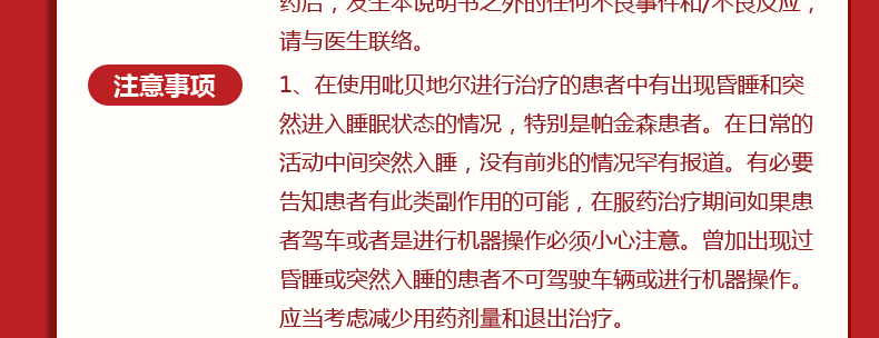 1.在使用吡贝地尔进行治疗的患者中有出现昏睡和突然进入睡眠状态的情况,特别是帕金森患者。在日常的活动中间突然入睡,没有前兆的情况罕有报道。有必要告知患者有此类副作用的可能,在服药治疗期间如果患者驾车或者是进行机器操作必须小心注意。曾加出现过昏睡或突然入睡的患者不可驾驶车辆或进行机器操作。应当考虑减少用药剂量和退出治疗。