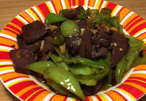 材料:猪血1块,青椒适量,盐和料酒少许,蒜末适量