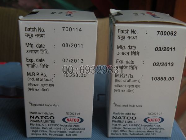 7.价格。现在竞争激烈,真药假药鱼龙混杂,有的真药卖1600(良心价),有的假药竟然要2400甚至更高(良心被狗吃了)。价格纯粹是心里影响,无鉴别价值!!价格的下降有以下因素:竞争激烈,假药把价格拉下来了(1300的假药我都见过,而且病人还吃了很久);印度各厂家参与了竞争(以后会写到),人民币升值(这是我所知道的人民币升值对我们的唯一好处)!