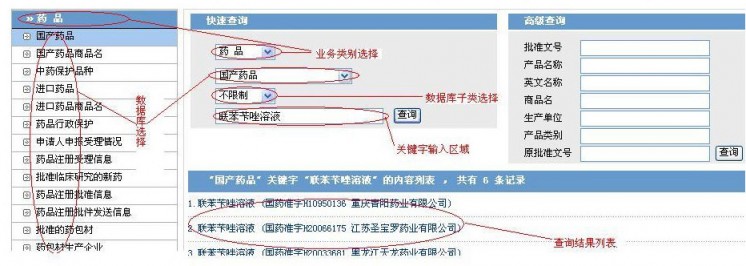 快速查询,选择数据库后只需输入关键字,可对所选数据库进行多项内容的快速查询。操作步骤如下(以国产药品数据库为例):