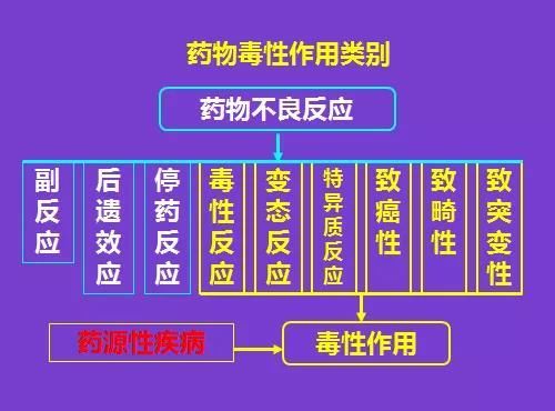 毒性作用是药物不良反应的一部分,往往是药物固有的作用,在剂量过大或蓄积过多是体现的危害性反应。在一般情况下是可以预知的,但不一定是可以避免的。变态反应和特异质反应也归属于药物毒性作用。(急性毒性损害:循环、呼吸及神经;慢性毒性损害:肝、肾、骨髓、内分泌)