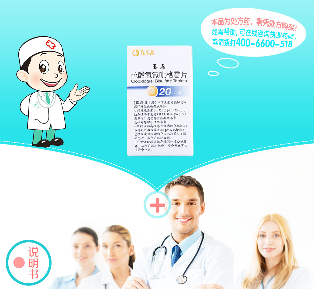 【适应症】 用于以下患者的预防动脉粥样硬化血栓形成事件:心肌梗死患者(从几天到小于35天),缺血性卒中患者(从7天到小于6个月)或确诊外周动脉性疾病的患者。急性冠脉综合征的患者:非ST段抬高性急性冠脉综合征(包括不稳定性心绞痛或非Q波心肌梗死),包括经皮冠状动脉介入术后置入支架的患者,与阿司匹林合用。用于ST段抬高性急性冠脉综合征患者,与阿司匹林联用,可合并在溶栓治疗中使用。