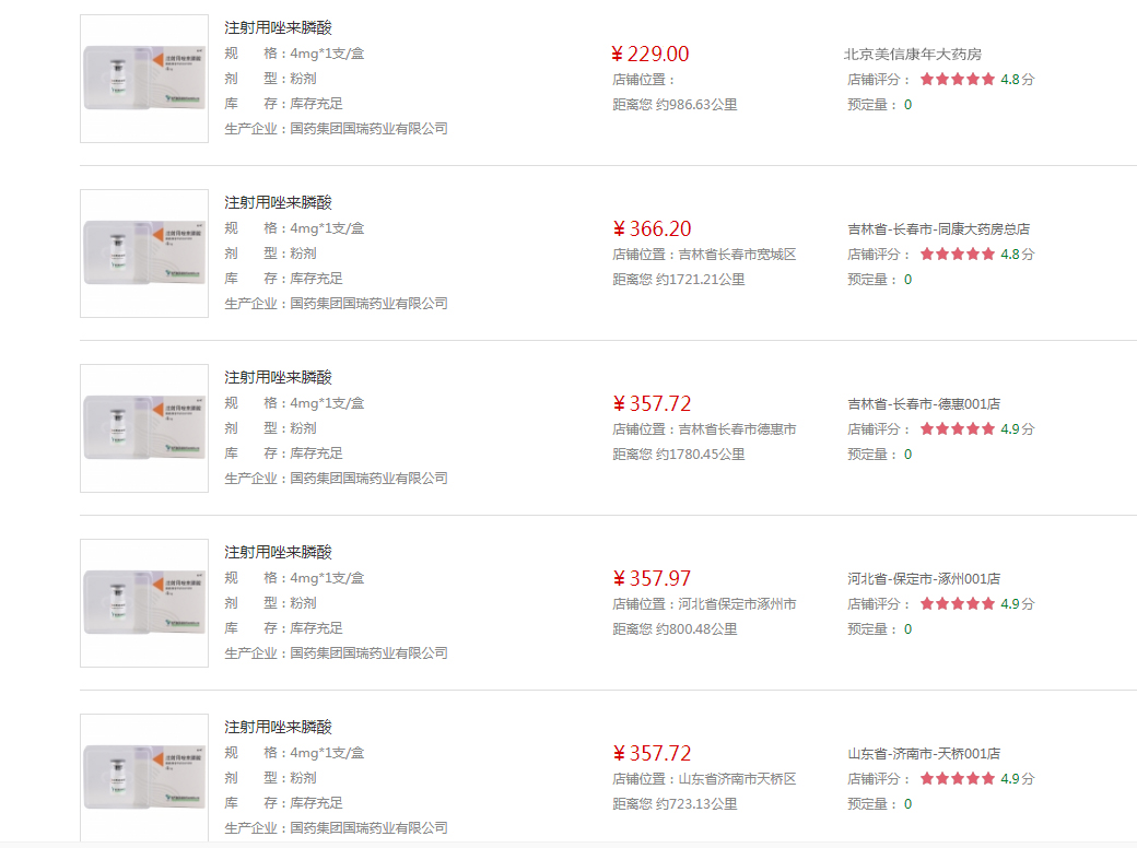 艾瑞宁(注射用唑来膦酸)价格对比表