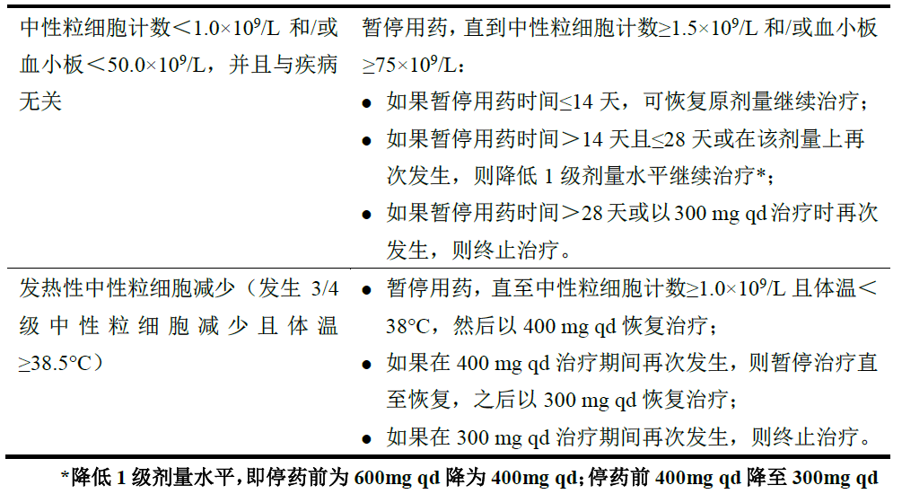 在本品使用过程中,可以通过中断给药、降低剂量或终止治疗等方式处理骨髓抑制,必要时给予输注血小板和红细胞。发生中性粒细胞减少或血小板减少时的剂量调整见表1。