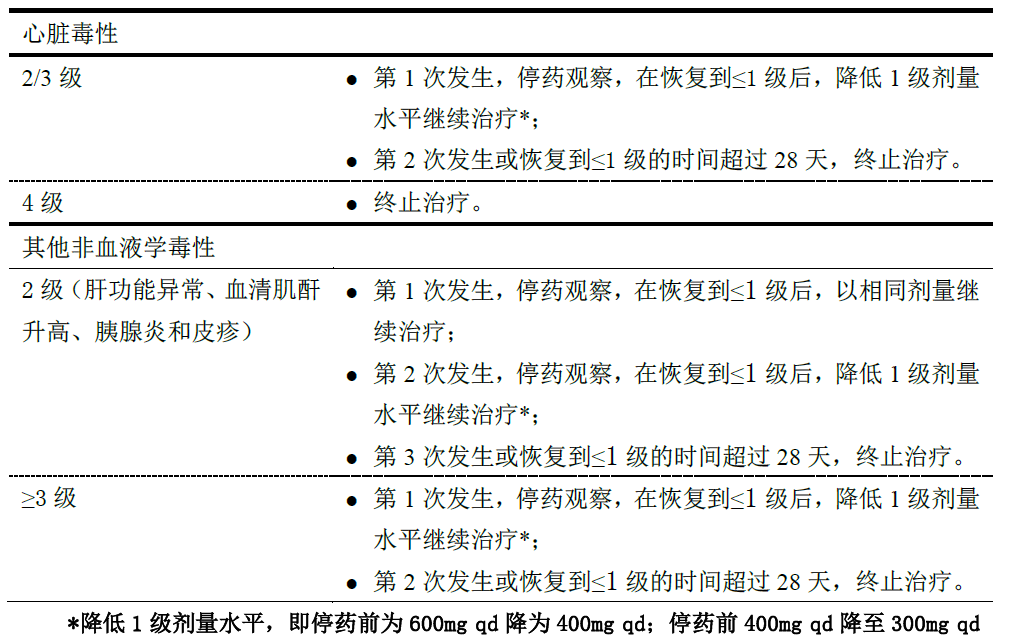 在Ⅰ期耐受性临床研究中,有17 例CML 慢性期患者暴露在800mg 剂量水平及以上(包括每日1 次和每日2 次给药方式),3 级及以上不良反应有血液学毒性(白细胞降低2 例、中性粒细胞降低2 例、血小板降低2 例和血红蛋白降低1 例)、胃肠道反应(腹泻3 例)和肝功能异常(γ-谷氨酰转移酶升高1 例),这些不良反应经对症处理后,患者均恢复正常。