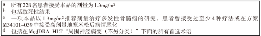 在未经治疗的且适合骨髓移植的多发性骨髓瘤患者接受本品静脉注射(1.3mg/㎡)后,可能与本品有因果关联的不良反应列于下表。在MMY-3003研究中,410名接受本品联合多柔比星和地塞米松治疗的患者与411名接受长春新碱、多柔比星和地塞米松治疗的患者进行对比;在IFM2005-01研究中,239名接受本品仅联合地塞米松治疗的患者与239名接受长春新碱、多柔比星和地塞米松治疗的患者进行对比;在MMY-3010研究中,130名接受本品联合沙立度胺和地塞米松治疗的患者与126名沙立度胺和地塞米松治疗的患者进行对比。上述三项研究(MMY3003、IFM2005-01和MMY3010)若在移植情况下进行,则下表中所列不良反应仅限于诱导期。