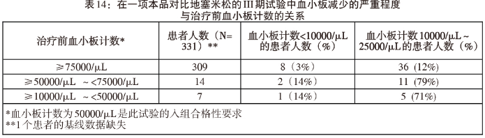 在既往未经治疗的套细胞淋巴瘤患者中进行了一项本品与利妥昔单抗、环磷酰胺、多柔比星和泼尼松(VcR-CAP)联合治疗研究,结果显示VcR-CAP组≥4级血小板减少症不良反应的发生率为32%,而利妥昔单抗、环磷酰胺、多柔比星、长春新碱和泼尼松(R-CHOP)组则为2%。VcR-CAP组和R-CHOP组≥3级出血不良事件的发生率分别为1.7%(4例患者)和1.2%(3例患者)。
