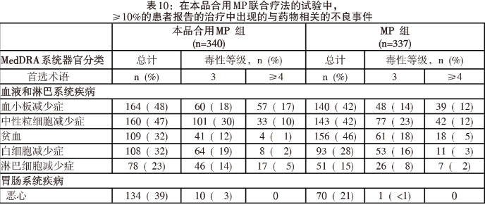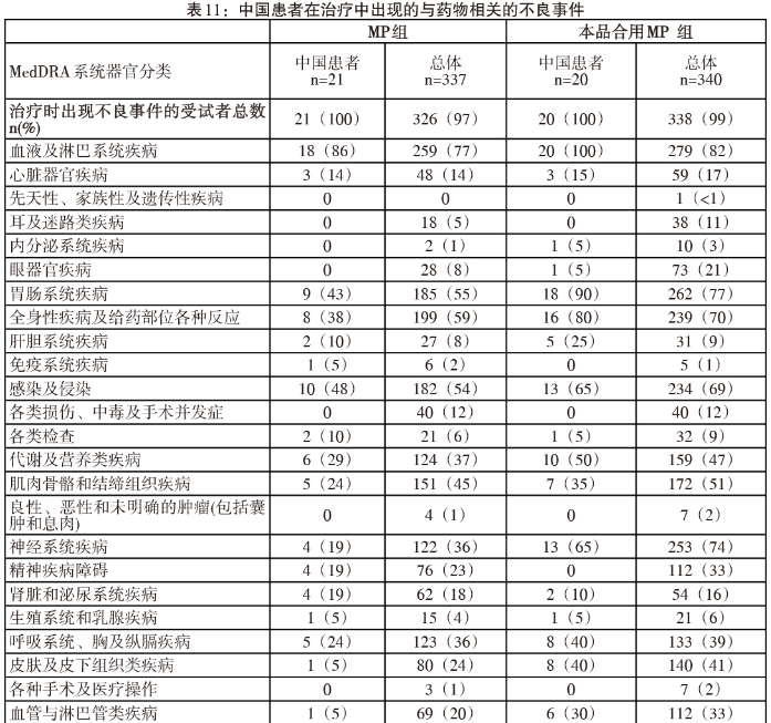 此项针对未经治疗的多发性骨髓瘤患者的研究入选了41例中国患者,其中20例被随机分入本品联合MP治疗组,21例被随机分入MP治疗组。下表列出了中国患者在治疗过程中出现的药物相关不良反应。