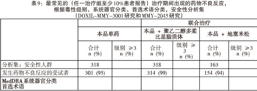 下表总结了接受本品联合地塞米松(MMY-2045研究)或本品联合聚乙二醇多柔比星脂质体(DOXIL-MMY-3001研究)治疗复发的多发性骨髓瘤,至少10%患者报告的药物不良反应。