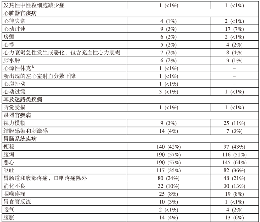 接受皮下给药的患者发生3级或以上毒性的治疗中出现的药物不良反应的总发生率比静脉给药组低13%(分别为57%对70%),导致停用本品的比例比静脉给药组低5%(22%对27%)。有关腹泻(皮下组为24% 对静注组为36%)、胃肠和腹部疼痛(皮下组为6% 对静注组为26%)以及周围神经病变(不另分类)(皮下组为38% 对静注组为53%)的总体发生率,皮下组比静注组低12%-15%。另外,3级及以上毒性的周围神经病变的发生率皮下组比静注组低10%(皮下组为6% 对静注组为16%),而且因周围神经病变而停药的比例皮下组(5%)比静注组(12%)低8%。